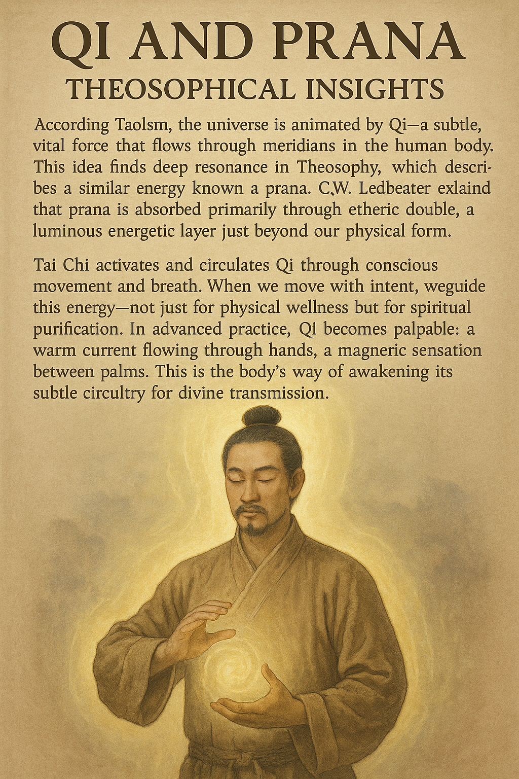 In both Taoist and Theosophical views, the human being is more than flesh. We are layered beings—physical, etheric, astral, mental, and causal. Tai Chi refines and strengthens the etheric double, the energy body that distributes prana/Qi into the physical system.